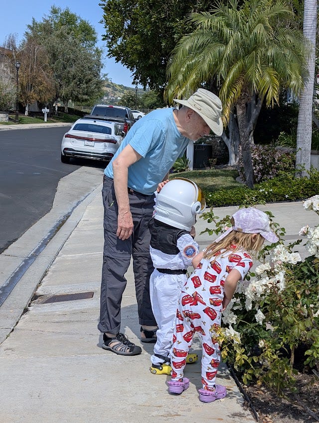 And super cute photo of you with the grand twins, one in his space helmet and one in her jammies like outfit, all smelling the roses, love it so much!